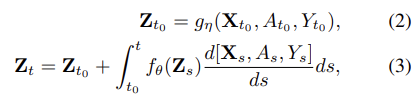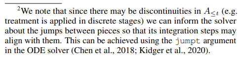 This formulation using a CDE permits to account for information available at t > 0 (rather than just initial value t = 0). In particular, neural controlled differential equations (Kidger et al., 2020; Morrill et al., 2021) allow incoming information to modulate the dynamics. This ability is natural in a clinical setting, as not only can we model the continuous-time latent state evolution of a patient trajectory, but also we account for incoming data (e.g. treatment changes) that modulate the dynamics of the system.