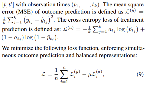 where µ > 0 is a hyper-parameter controlling the trade-off between treatment and outcome prediction. Note that the minus sign before L^(a) would effectively maximize the treatment prediction loss and ensure that zt is not predictive of treatment assignment At. This leads to balancing representations, which remove bias introduced by time-dependent confounders and allow for reliable counterfactual estimates.