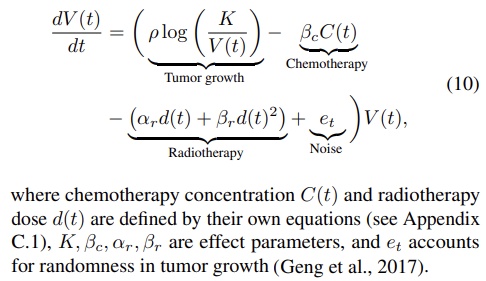 We use a well-established biomathematical PK-PD model for tumor growth in lung cancer patients that includes the effects of chemotherapy and radiotherapy (Geng et al., 2017). The PK-PD model is representative of the true underlying physiological process with responses to interventions. Hence, results using the model should be closely representative of reality. Additionally, the same underlying model was also used by Lim et al. (2018) and Bica et al. (2020b). We briefly describe it below and refer the reader to Appendix C for more details. The tumor volume at time t after diagnosis is modeled as follows: