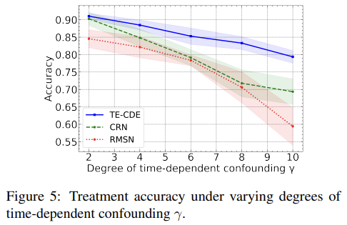 Figure 5 shows decreasing accuracy for all methods as time-dependent confounding increases. However, for all values of γ, TE-CDE outperforms both CRN and RMSN, more frequently selecting the optimal treatment. Similar to the other experiments, as γ increases, the performance gap between TE-CDE and both CRN and RMSN increases, with c. 4% difference in absolute treatment selection accuracy at γ = 4 increasing to c. 10% at γ = 10. This experiment emphasizes that differences in counterfactual estimation result in meaningful differences in treatment selection accuracy.