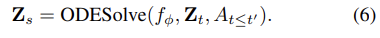 where t' denotes a desired time horizon, Z_t is the latent state of Z at time t which encodes the patient’s history, and As represents the hypothetical treatment schedule for t < s < t' . fφ : R^l+1 → R^l is a feed-forward neural network with trainable weights φ. As before, the decoded path can be obtained by solving the IVP: