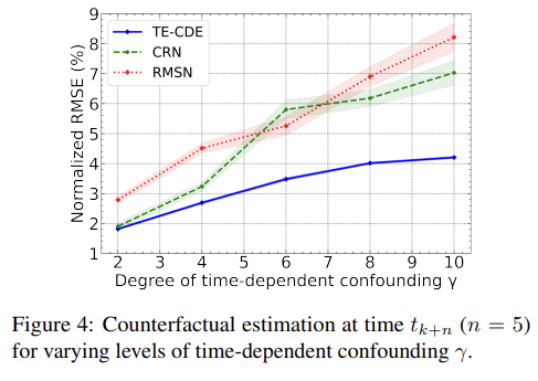 As an illustrative example, we evaluate counterfactual estimation at time t_k+n, i.e. estimate tumor volume y_tk+n . Similar to other experiments, we vary the degree of time-dependent confounding γ = {2, 4, 6, 8, 10}, fix κ = 10, and set the forecasting horizon n = 5 (see Appendix F.8 for other time horizons). As expected, it is more challenging to estimate counterfactuals further in the future. As shown in Figure 4, similar trends are observed as the setting of Section 5.2 (Figure 3). TE-CDE outperforms both CRN and RMSN for all γ, with a greater performance differential as the degree time-dependent confounding increases. For γ = 10, there is a 40% reduction in RMSE for TE-CDE.